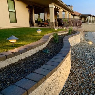 This dramatic backyard transformation tackled the challenge of a sloped, unusable dirt yard by constructing retaining walls that eliminate the grade issues and create a level, raised patio area. This solution maximizes usable outdoor space while providing proper drainage and structural stability for Arizona's soil conditions.