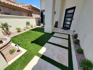 This elegant courtyard transformation replaced outdated paver patios with sophisticated travertine stepping stones nestled within premium artificial turf. The natural stone's warm tones and smooth texture create a modern, clean aesthetic that perfectly complements the home's architectural style while providing comfortable pathways throughout the space.